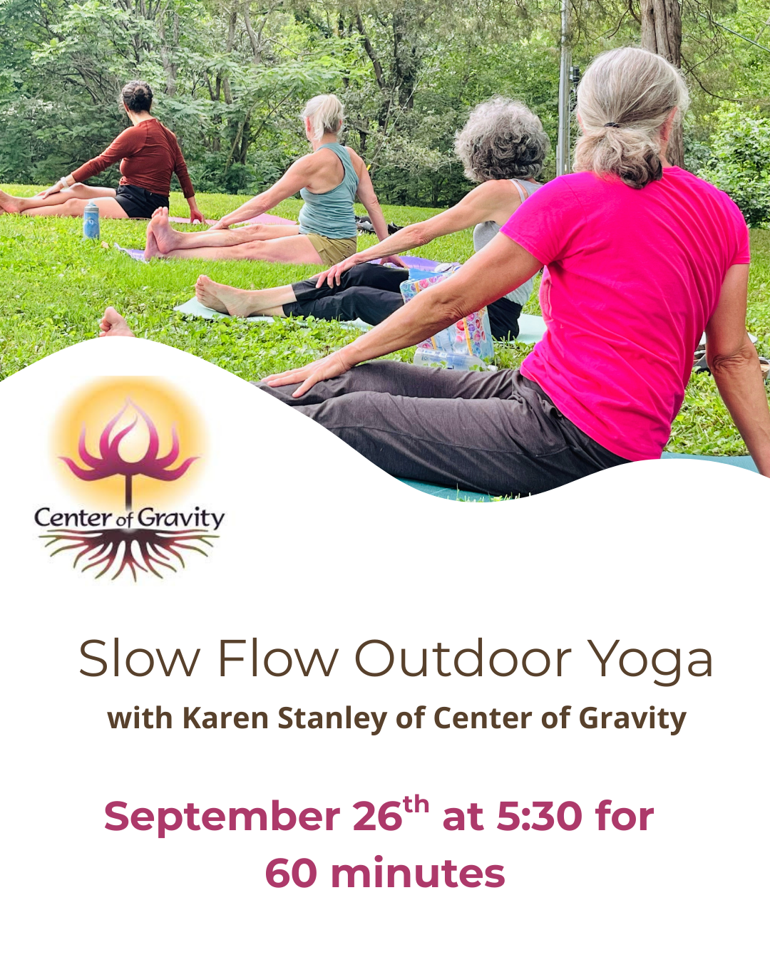 (in case of bad weather, please check the Center of Gravity Facebook or Instagram page for updates and class will move back into the studio if need be.)