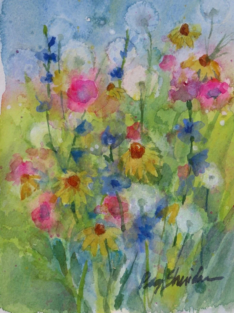 Have you tried painting in watercolors, only to get frustrated? Or have you enjoyed them in the past but have been away from them for too long? Join Peg as she takes you through basic skills such as setting up your palette, working on wet and dry paper, using a wet and dry brush, fixing mistakes, 3 ways of mixing colors, and planning a painting. Then follow her in two simple step-by-step watercolor paintings of wildflower and/or garden scenes.